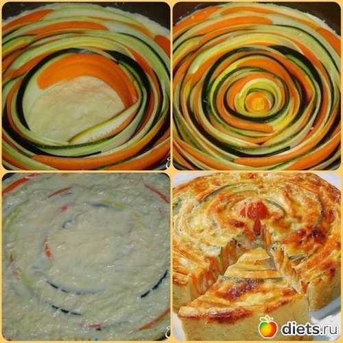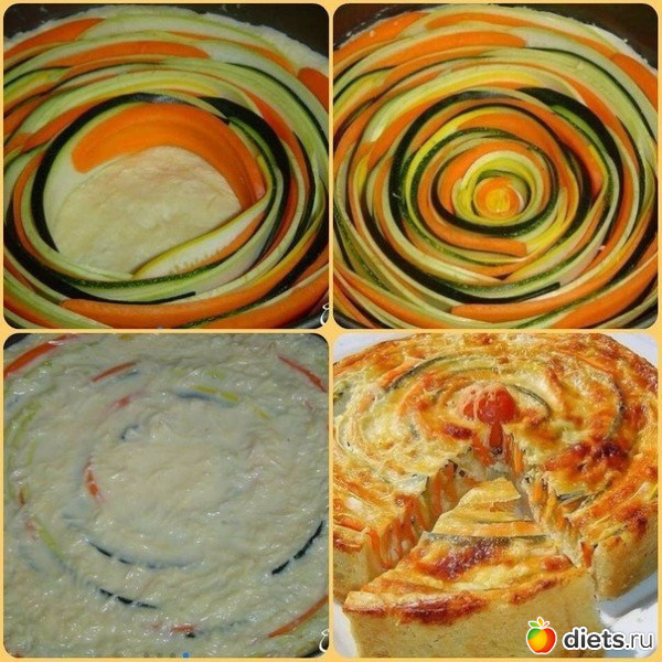 постепенно двигаясь к центру, чередуя кабачок, цукини и морковь.