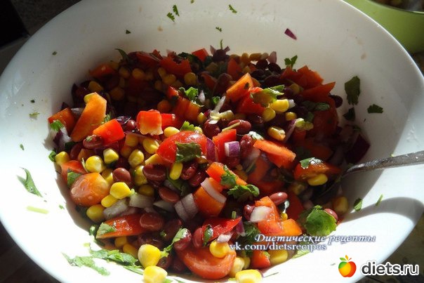 Порезать лук, помидор, перец, смешать с бобами и кукурузой, добавить кинзу и заправить лимонным соком. Соль, перец – по вкусу.