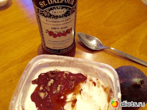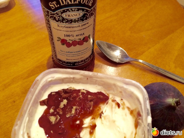Завтрак: Творог "Вкусный день" - 164 гр, клубничный джем - 58 гр, пекан - 15 гр, инжир - 1 шт. Итого - 422 ккал.