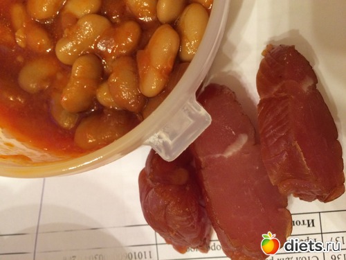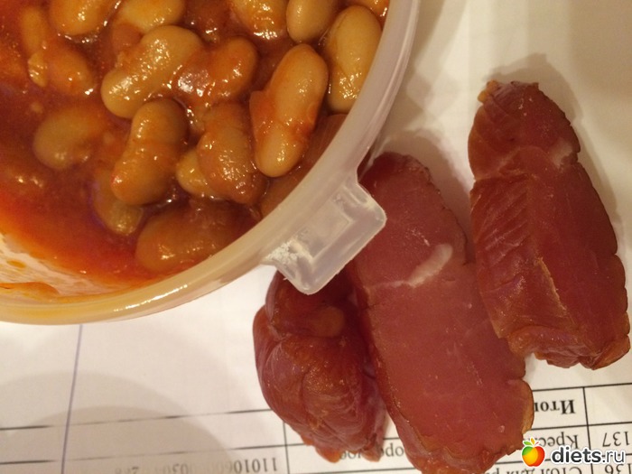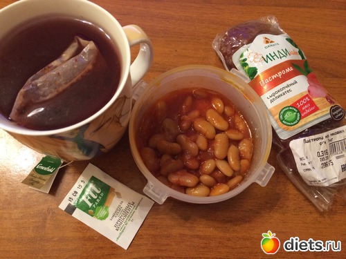 Ужин (ранний, на работе): печеная фасоль в томатном соусе - 103 гр, пастрома из индейки - 151 гр, чашка чая с фитпарадом, 1 киви. Итого: 337 ккал.