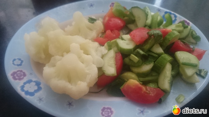 В 14-30 вареная цветная капуста 150 грамм и салат из свежих овощей 150 грамм