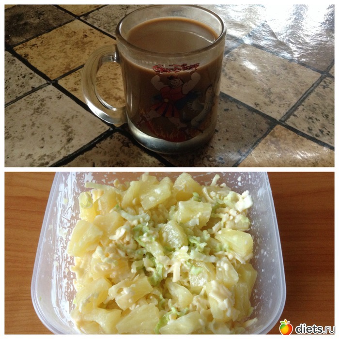 Если интересно, рецепт: капуста, ананас, чуть чесночка, сыр и ложка йогурта... в оригинале еще филе курицы, кукуруза и заправка майонезом...