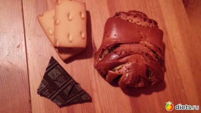 У: полоска шоколада+ чай зеленый+ что нить то(может булочка, может печенка)