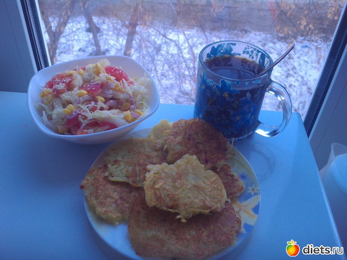Кофе( чай закончился), салатик из капусты, кукурузы, помидорки и красного лука. Заправлен маслом, украшен кунжутом. И драники. Драники получились так себе, на масле куда вкуснее:-)