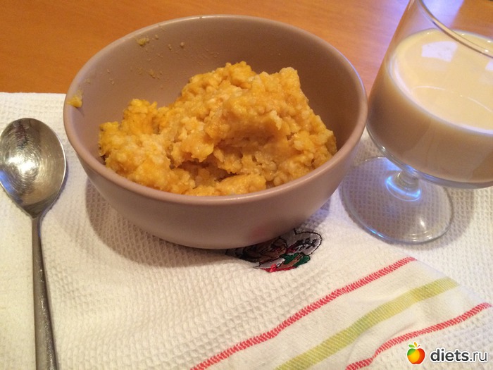 Завтрак: каша пшенная с тыквой - 301 гр, топленое молоко 4% - 155 гр.