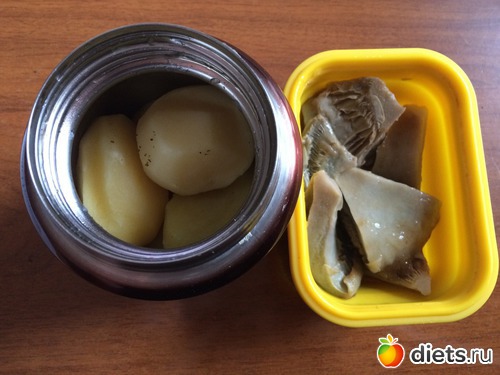 Обед: картофель отварной без масла - 251 гр, грибы соленые - 150 гр, масло нерафинированное - 3 гр.