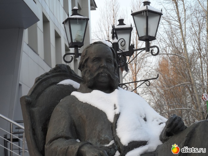 Великий писатель Гончаров задумчиво глядит на прохожих.