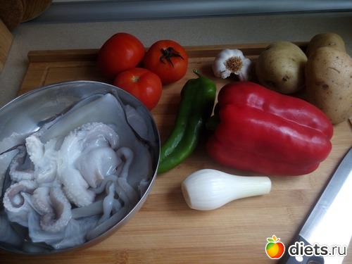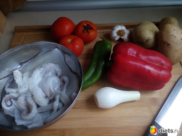 Добавить картофель к каракатице, при необходимости долить воды и продолжать тушить еще примерно 30 минут.