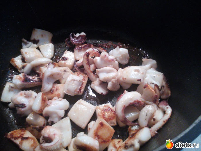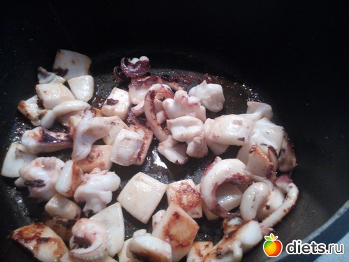 В глубокую толстостенную кастрюлю влить 4 ст.л. масла, раскалить и поджарить до золотистой корочки нарезанную не слишком крупными кусками каракатицу.