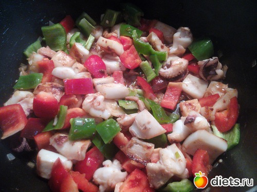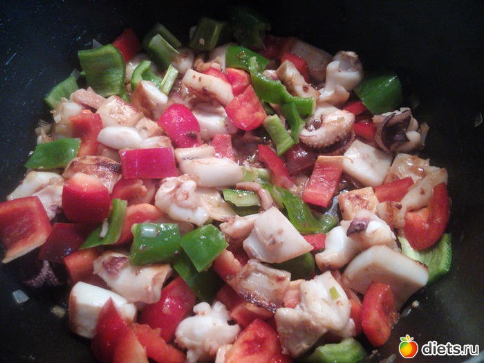 Когда выделяемая каракатицей жидкость вся испарится, начнет образовывать зажарки на дне кастрюли, а куски каракатицы начнут "постреливать", время убавить огонь на средний, добавить лук и чеснок, посолить и закрыть крышкой, чтобы всё вместе начинало выделять сок и тушиться.