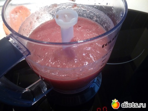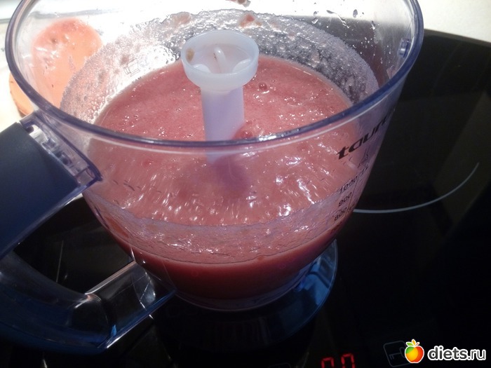 Тем временем порезать крупными кубиками оба перца и перетереть помидоры (или перемолотить в чаше процессора с винтовыми ножами).