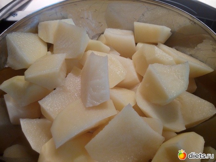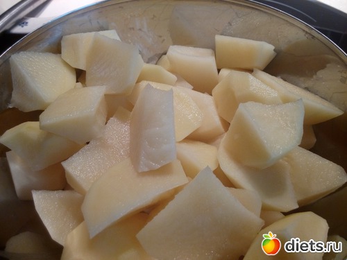 Картофель почистить и порезать крупными кубиками (чтобы картошка лучше выделяла крахмал и загустила соус, в подобные блюда я её предпочитаю резать "с отломом", т.е. держа картофелину в руке, надрезаю ножом нужный кусок, но не до конца, а только до половины и, помогая себе все тем же ножом, отламываю недорезанный кусок от картофелины).