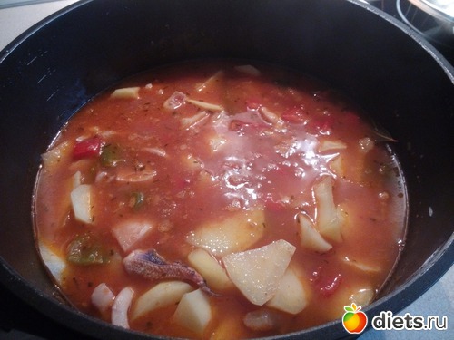 Когда запах алкоголя от вина испарится (пара минут), влить вскипяченную воду, с тем рассчетом, что позже туда будет добавлена картошка и должна получиться консистенция очень густого супа. Попробовать на соль и оставить тушить под закрытой крышкой на медленном огне (3 из 9 на электроплите) примерно полчаса.