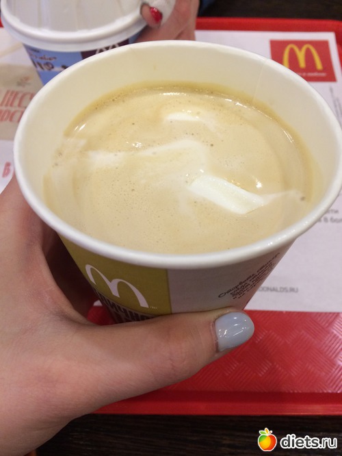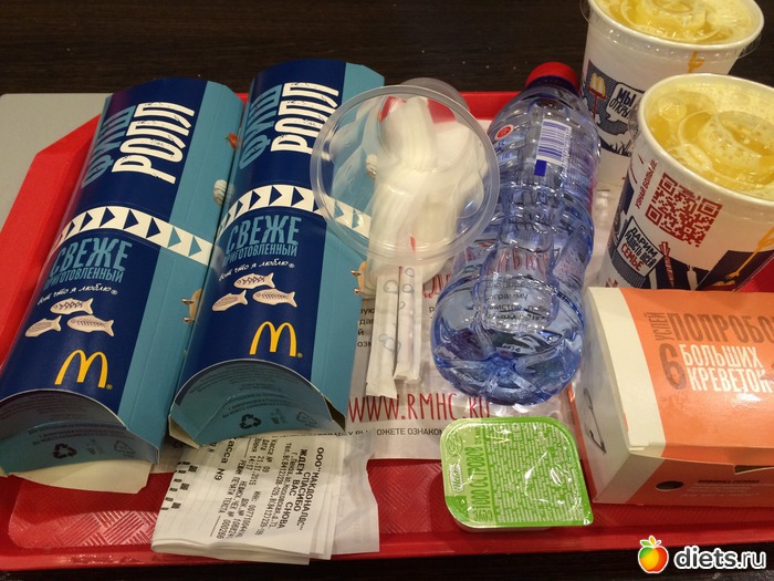 Обед: 1 фиш ролл, 3 креветки, соус "1000 островов", сок апельсиновый, кофе глясе (выпила только растопленное мороженое