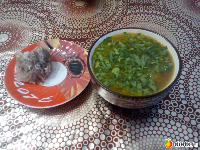 Обед - гороховый суп на курином бульоне с зеленью (без картошки), кусочек говяжьего