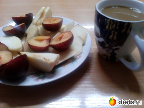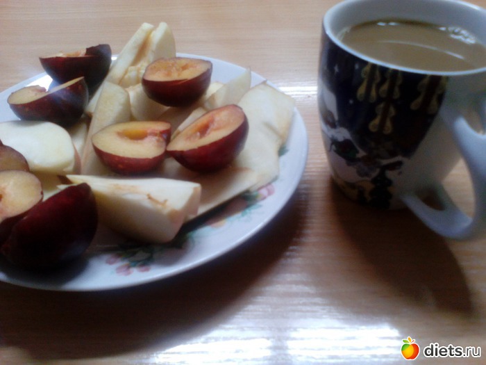 Завтрак: сливы, яблоко, кофе с молоком.
