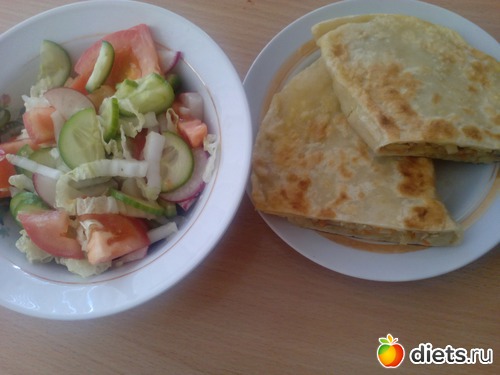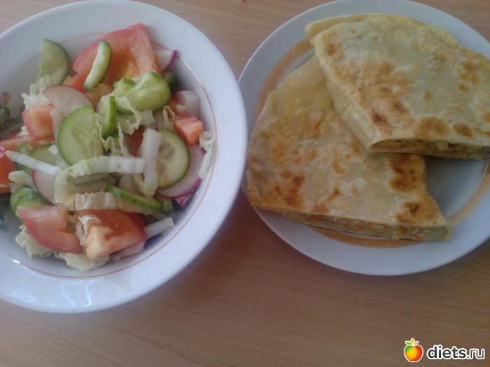 Обед: салат пекинка+ огурец +помидор +редиска+масло, кутабы с тушеной капустой