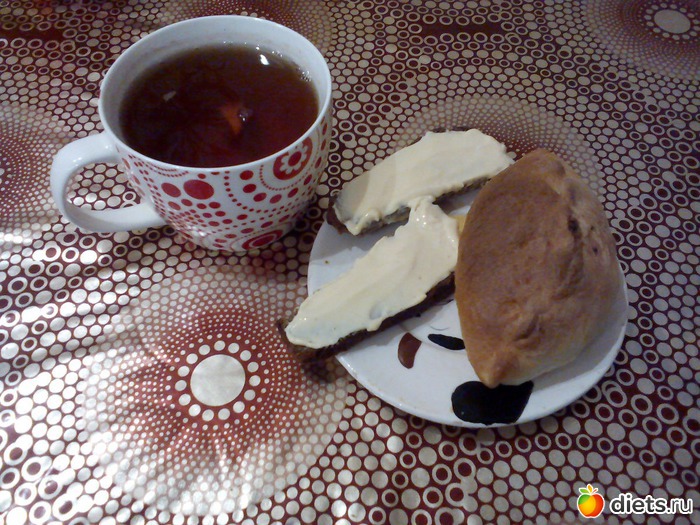 Завтрак - пирожок с мясом, 2 кусочка чёрного хлеба с плавленным сыром, черный чай без сахара
