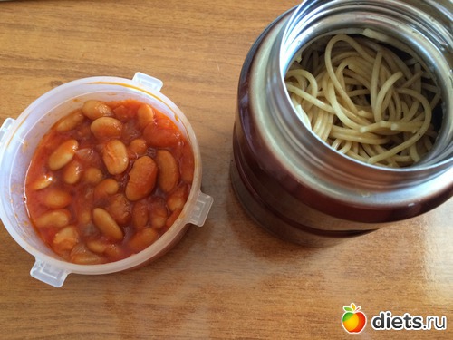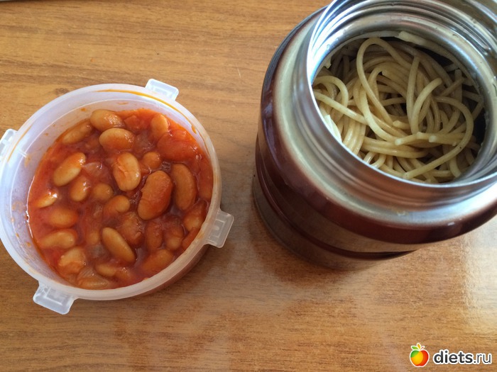 Обед: цельнозерновые спагетти - 210 гр, фасоль печеная Пиканта - 146 гр.