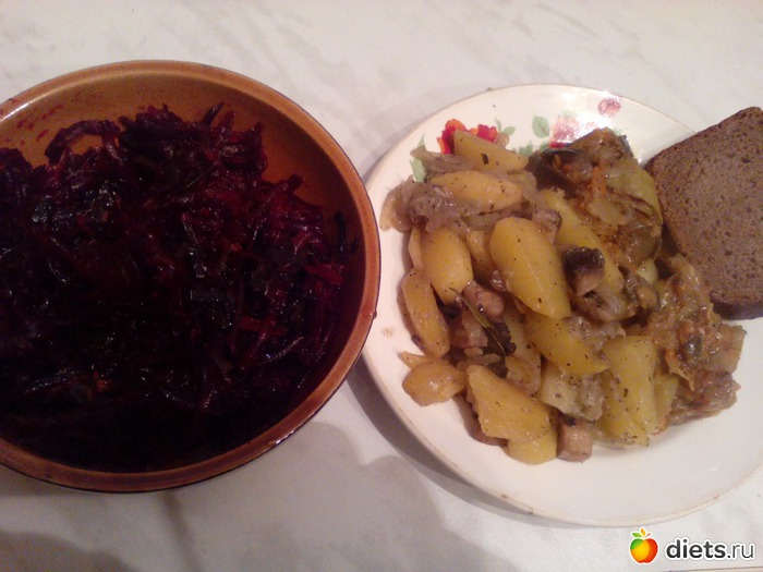 Обед: салат вареная свекла + морская капуста, картошка с грибами тушеная в духовке, тушеные овощи, 1 кусочек хлеба.