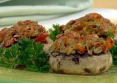 Грибные шляпки нафаршируйте приготовленной начинкой, посыпьте сыром. Запекайте шляпки 15 минут при 200°С.