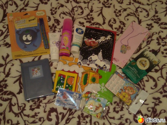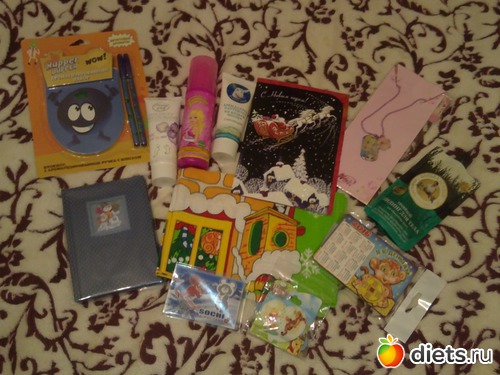 Остальные подарки дети разделили после небольшого междусобойчика. Саше достался кулончик и заколочка, а Ксении-блокнотик-смайлик и ручки. Средством для легкого расчесывания договорились пользоваться вместе