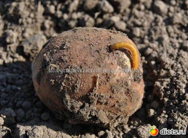 Проволочник, предпочитает кислые почвы, повреждает не только картофель, но и морковь, свеклу. Способы борьбы с ним самые разнообразные. При посадке корнеплодов и других овощей весной можно опудрить семенной материал смесью "Базудина" и золы (пакет "Базудина", 1 л сухого песка, 1 л сухой золы). Применяют еще такой народный способ: натереть на терке гриб трутовик (200 г), залить 2 л кипятка, настоять 8-10 часов, вылить в лейку или опрыскиватель, добавив 10 л воды. Растения опрыскивают дважды за сезон с интервалом в 2 недели.