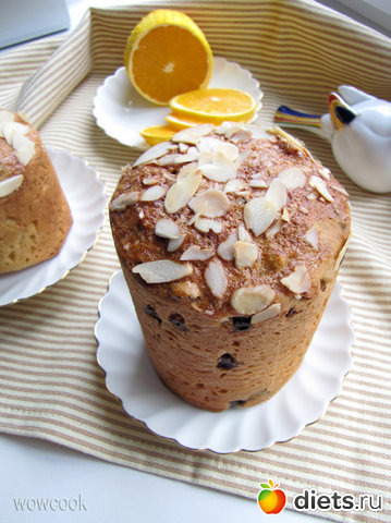 - Взбить слегка белок, смазать верх панеттоне, посыпать гранулированным сахаром и пластинками миндаля