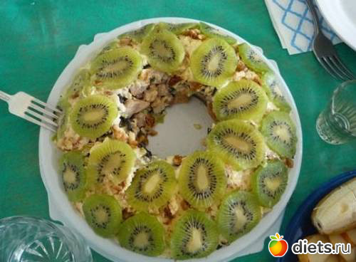 Киви очистить и нарезать тонкими кружками, выложить на салат.