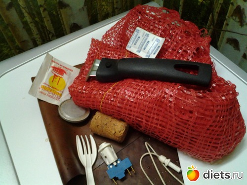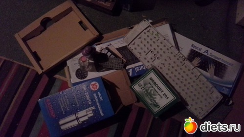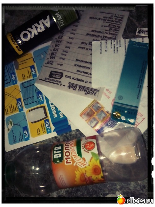 Итак, коробки из-под конфет и трусов, 4 севших батарейки, просроченная каша, клубок ниток, съеденный молью, 6 старых каталогов и один пустой блистер из-под таблеток - итого 15 шт.