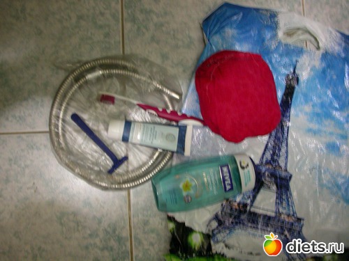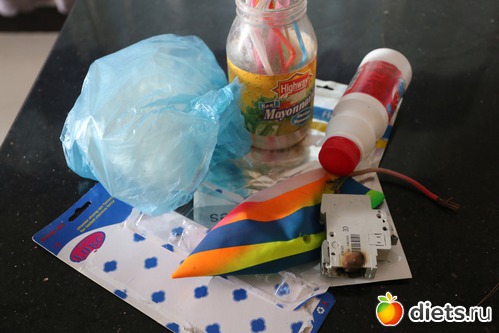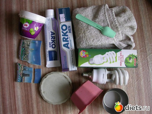 упаковка о лампочки, старая лампочка, упаковка от крема, старый крем, лопатка-ложка, старое полотенце, ржавая крышка, баночка, 2 чашечки, разбившийся магнитик из Куала-Лумпура (вот его реально жалко, в смысле жаль, что разбился, опять туда за ним лететь придётся..