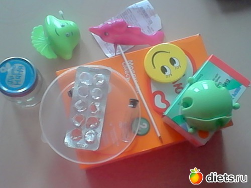 1.Коробочка из-под смеси; 2.Дельфиньчик уже не плавающий; 3.Непонятная игрушка из кукурузных палочек 4.Чек; 5.Баночка из-под пюре; 6.Сломанный элемент мазайки; 7.Коробка от лекарства; 8.Аскорбинки тоже закончились; 9.Крышка от контейнера; 10.Паста; 11.Флакон от лекарства; 12.Значок.