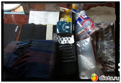 Шарф, труселя мужа, пояс, упаковочные пакеты, коробка
