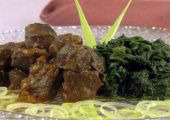 При подаче гарнируйте печень припущенным шпинатом и оформите кольцами лука.