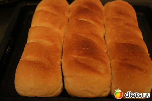 получаются вот такие батоны - сегодня на вид корявенькие,торопилась и передержала немного ,но вкусные.. только достала из духовки, пока ходила за фотоаппаратом ,дети один съели, у меня на противень 4 убираются, вот каждый день и пеку..