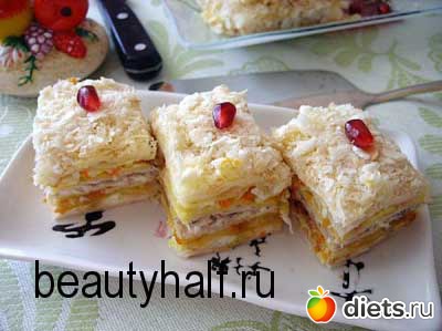 Украсить поверхность закусочного торта на свое усмотрение, можно зернами граната или зеленью. Поместить слоеный торт с консервой в холодильник на пару часов (желательно оставить на ночь, чтобы он лучше пропитался). Если хотите уменьшить время, необходимое для пропитывания такого торта, нужно каждый из коржей подержать над паром несколько секунд перед тем, как выкладывать на него начинку, - это несколько размягчит суховатые слоеные коржи.
