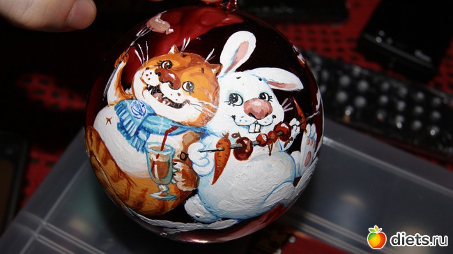 Тети/дяди елочные игрушки соответственно увлечениям (рыбаку - золотую рыбку, учительнице - сову с книгой, дачнице - помидор).
