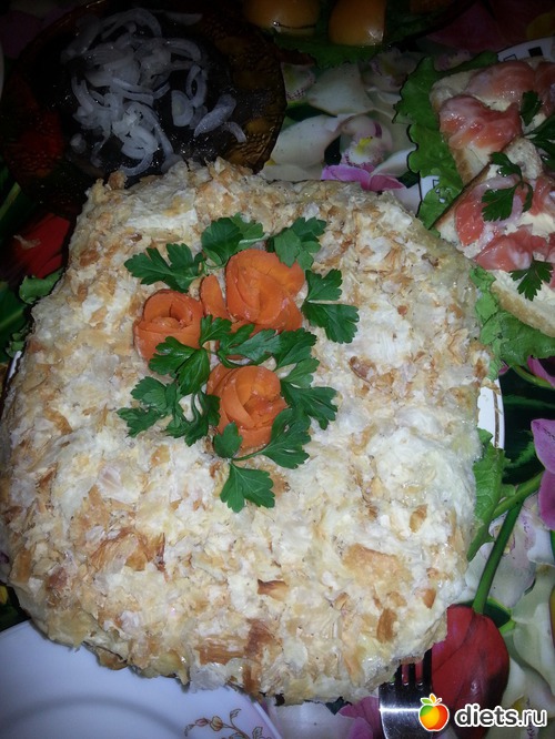 Это салат о котором писали на первой странице,но у меня другие игредиенты между слоями- отварная свекла с черносливом и майонезом-корж,сырок плавленный с чесноком и майонезом-корж,отварная морковь с майонезом и изюмом-корж,украшение.Ну очень пикатный вкус.