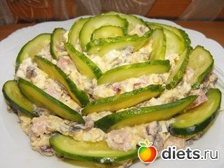 Все ингредиенты смешать (кроме огурцов),посолить, заправить майонезом или сметаной, перемешать. На плоской тарелке сформировать салат горкой. Нарезать тоненькие полоски огурца и, начиная с макушки, по часовой стрелке, наискось, поочередно вдавливаем их в салат и так до самого низа.