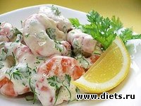 Перед подачей на стол заливаем салат соусом. Украшаем овощами и зеленью.