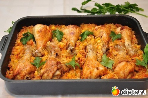 4. Курицу натереть со всех сторон солью, перцем и паприкой. Выложить на рис. Накрыть фольгой и поставить в духовку.