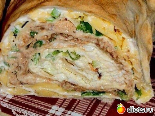 Разложить лаваш.Смазать каждый лист майонезом.На один-натереть яйца,на второй-сыр,на третий-помятую вилкой сайру.Сверху каждый лист посыпать луком и укропом.