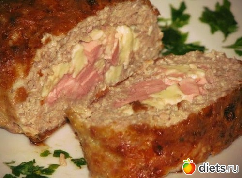 На пищевую пленку выложить фарш ровным слоем по высоте 1- 1,5 см, в виде прямоугольника 25*30. Выложить начинку в середину по высоте и свернуть в рулет при помощи пленки с двух сторон приподнять ее и склеить края рулета ( рулет получиться длиной 25 см). Выложить в форму смазанную маслом швом в низ. Отправить в духовку на 40-50 мин.