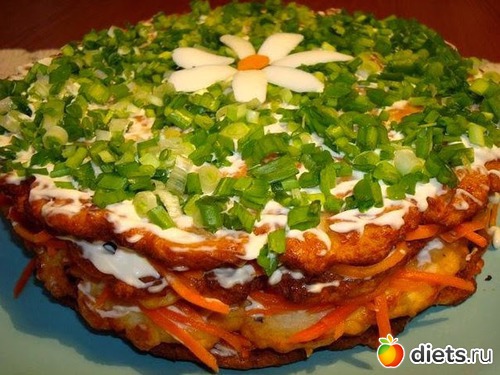 Филе и лук измельчить в блендере, вбить яйца, добавить молоко и муку, соль, перец, хорошо перемешать. Жарить на среднем огне на растительном масле, выкладывать массу на сковороду ложкой и быстро разровнять. Переворачивать и снимать блинчики кулинарной лопаткой. У меня получилось пять блинов. Далее взять майонез, добавить 2-3 зубка чеснока. Блинчик смазать слегка майонезом, положить на него морковь по корейски, опять блинчик + майонез + морковь и т.д. Верхний слой украсить по желанию. В исходном рецепте смазывать майонезом не предполагалось, но мне показалось, что тортик будет суховатый.