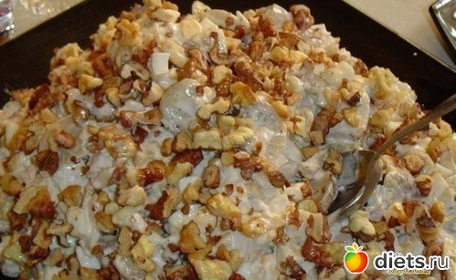 Смешайте все ингредиенты, оставив лишь немного орехов для украшения, и посолив и поперчив блюдо, заправьте салат Шерлок майонезом. Сверху красиво выложите оставшиеся орехи.