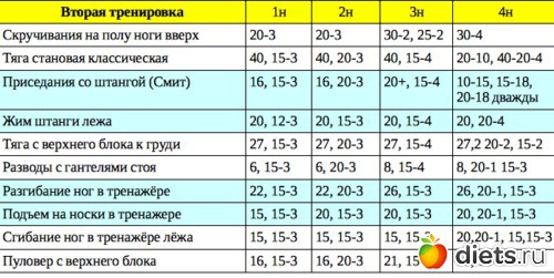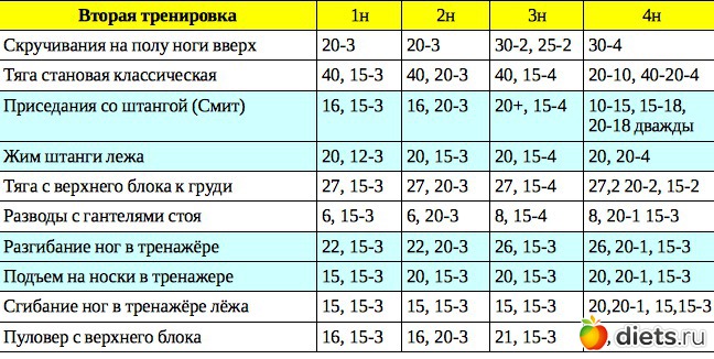 В табличке первая цифра - вес (если есть), потом - число повторов и через черточку - число подходов. Радует то, что уже все стала делать по 4 подхода и укладываться в час.