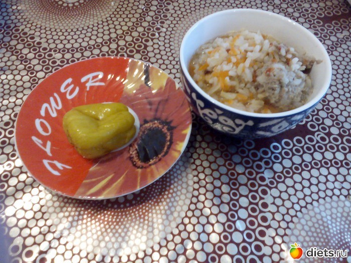 Обед - тушеная говядина с рисом и овощами + маринованный перец