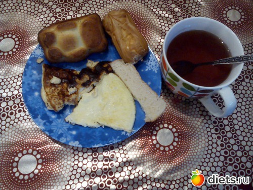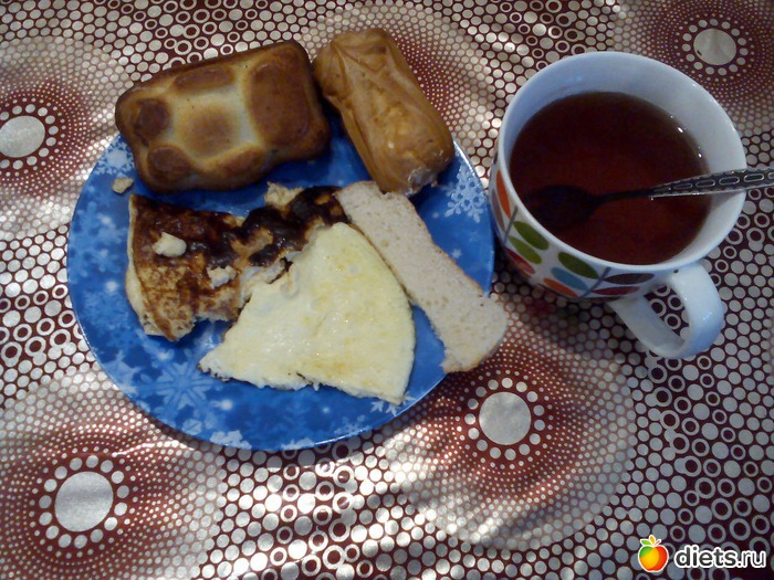 Завтрак - омлет, пироженое, кексик, чай без сахара