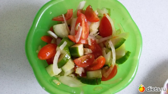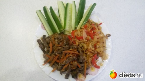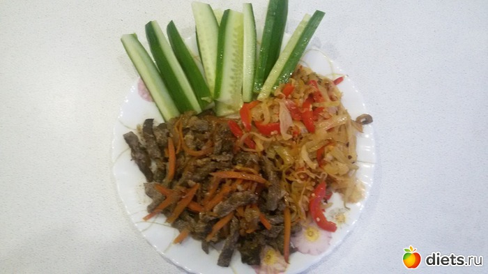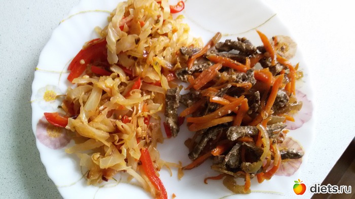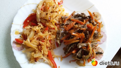 О: тушеная печень с тушенной капустой и салатик из огурцов, помидоров, лука и сельдерея.