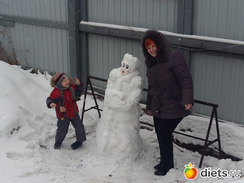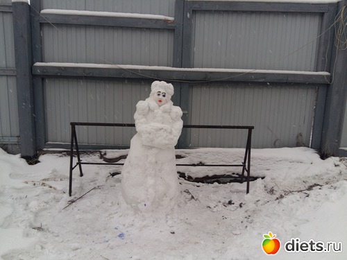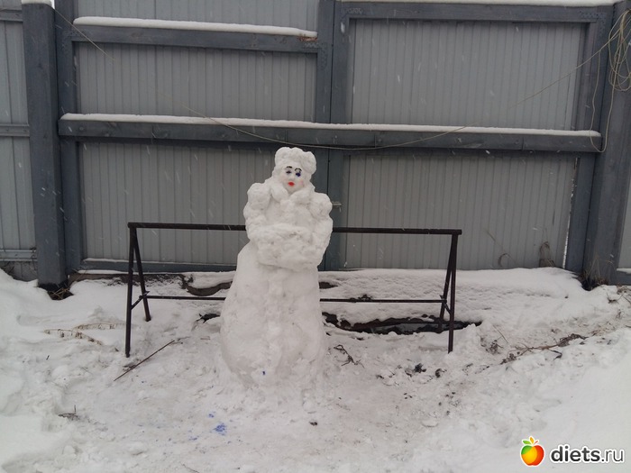 Сегодня ездили в гости к бабушке мужа, у нее собственный дом, там снега побольше чем у нас во дворе, ее дочка сделала снегурку
